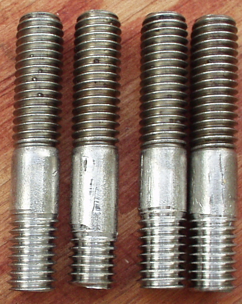 The manifolds, being new, came with new fasteners. Nothing special here: 5/16" SAE bolts with hex heads and split ring lock washers, plus some symmetrically threaded 7/16" NF studs for the flanges. But... the fasteners were plain old steel (with a light silver plating) and really didn't do the new manifolds justice. I was particularly unimpressed with the studs; exhaust flange studs have a hot nasty job, and regular-quality parts generally look terrible after a year or so in that position. Stripped threads and vibration wear let the flanges wander, and then the "pfft, pfft" is back.
