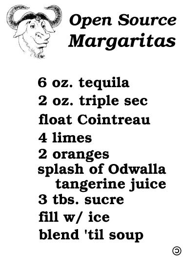 6 oz. anejo tequila 2 oz. triple sec a float of Cointreau the juice of 4 medium limes the juice of 2 medium oranges a splash of Odwalla tangerine juice 3 tbs. sugar fill blender with ice blend 'til soup